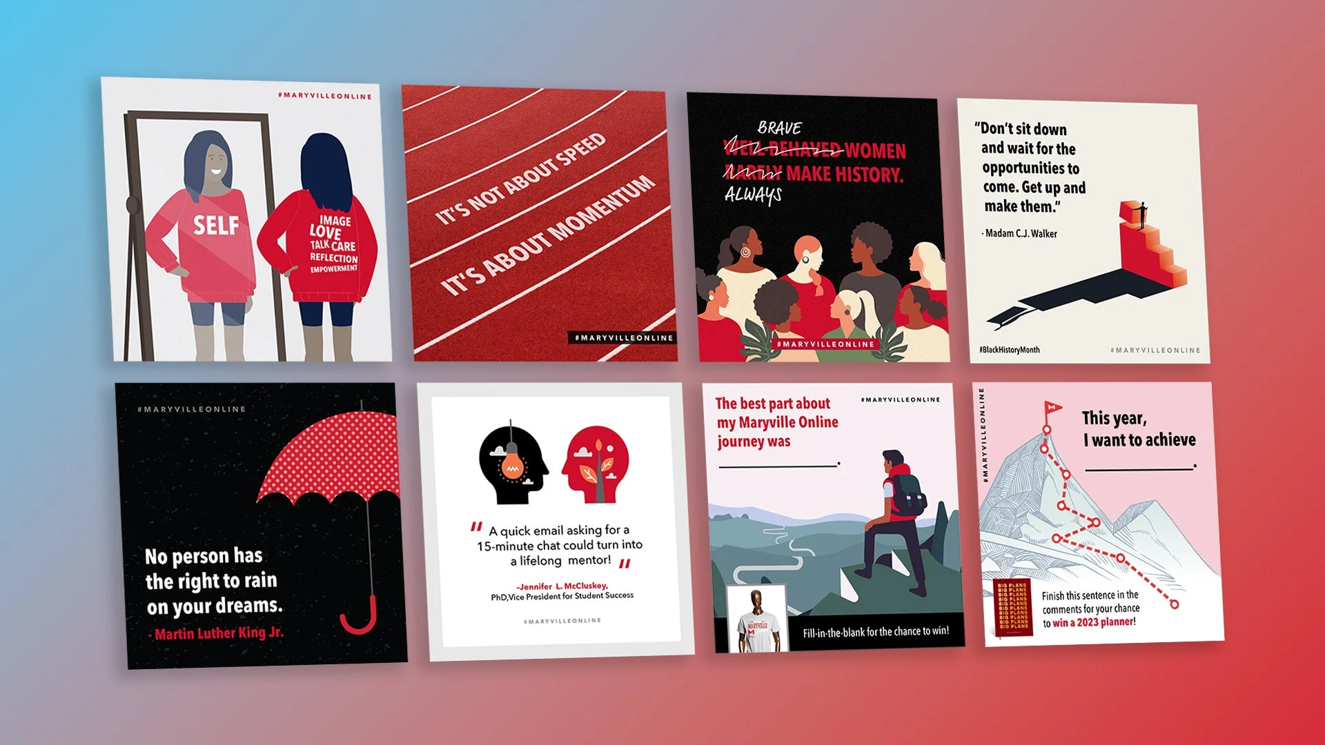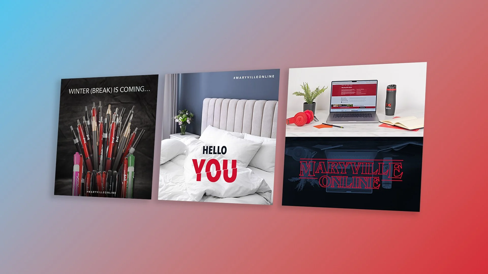We created a series of social posts for Maryville Online built around UGC and culturally relevant content for students. Each series was easy to produce month to month, tapping into real student experiences, trends, and everyday moments while highlighting the flexibility of online learning.