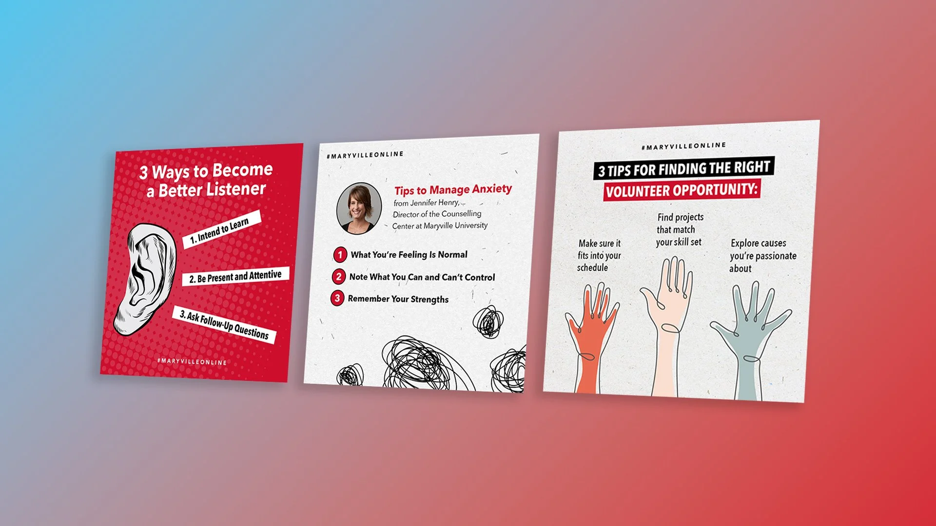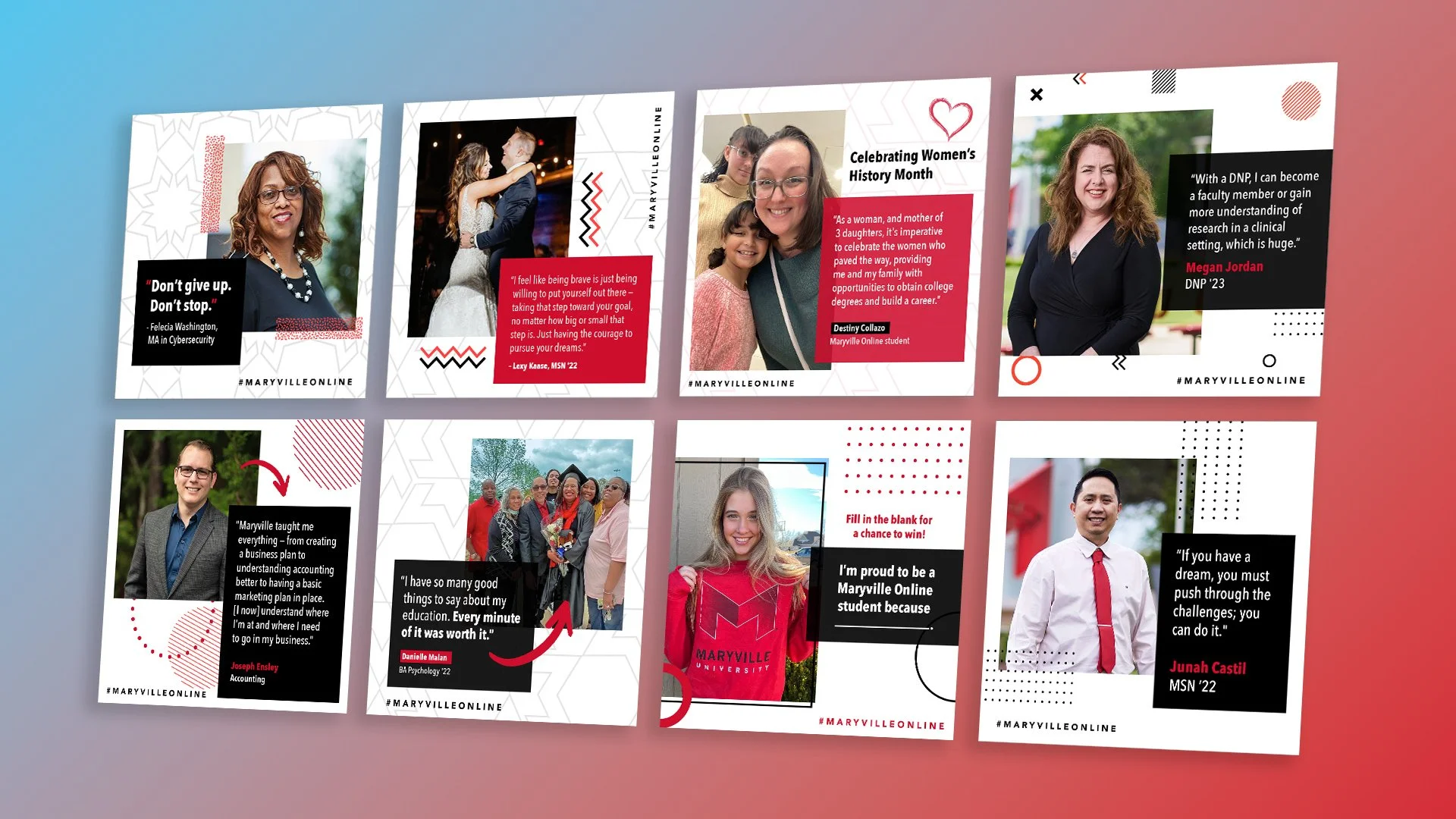 Authentic quotes and stories from Maryville Online students and alumni highlighted real experiences in the program. This content built credibility while letting the community speak for the brand.