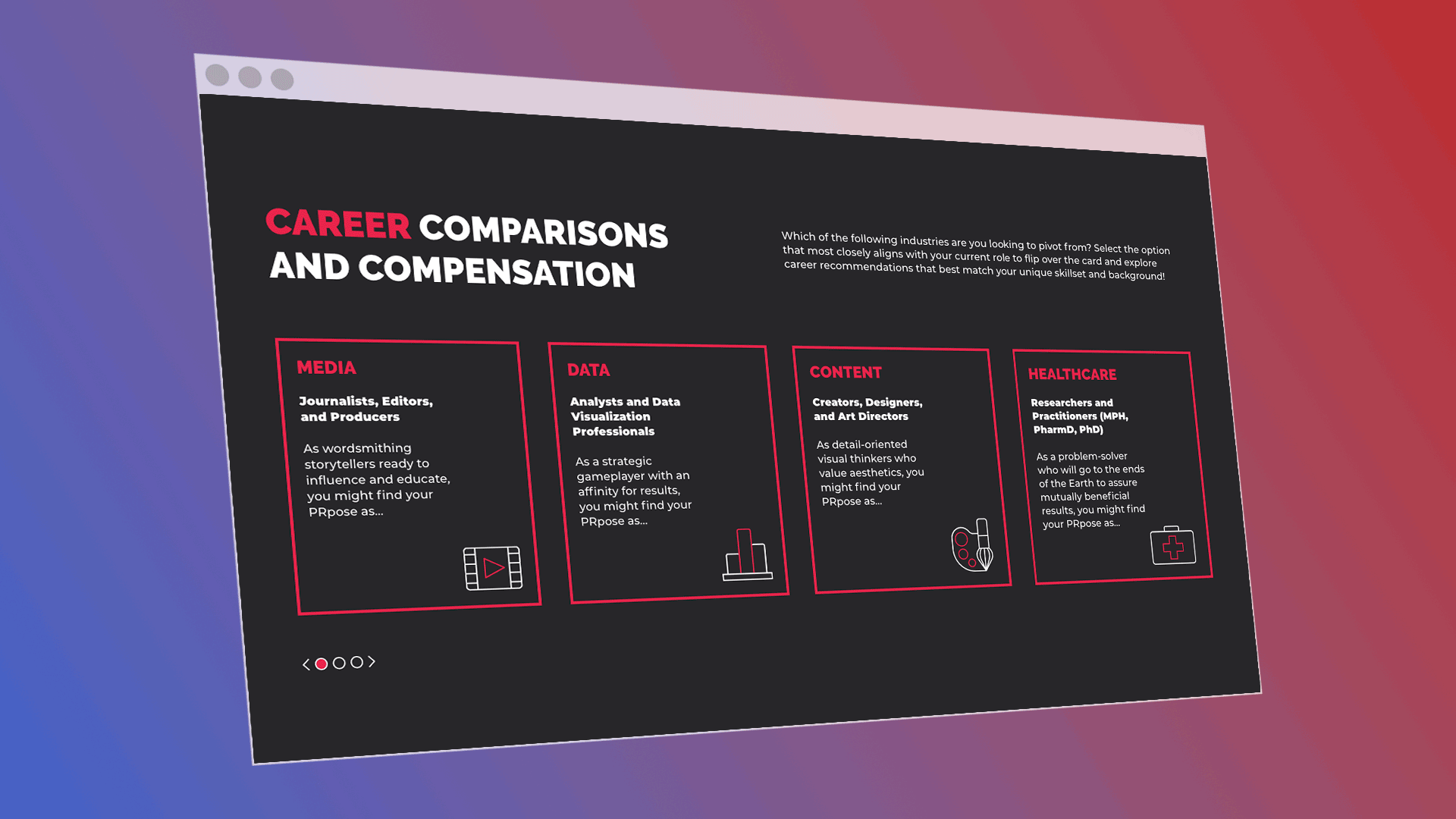 An interactive feature allows users to hover over familiar job roles to reveal comparable roles in PR. It highlights transferable skills and salary ranges to help make the potential transition feel more realistic.